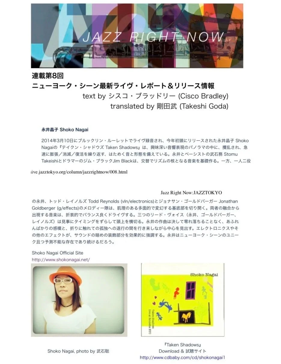 日本語訳 :2014年3月10日にブルックリン・ルーレットでライヴ録音され、今年初頭にリリースされた永井晶子 Shoko Nagaiの『テイクン・シャドウズ Taken Shadows』は、興味深い音響表現のパノラマの中に、攪乱され、急速に膨張/消滅/復活を繰り返す、はためく音と形態を備えている。永井とベーシストの武石務 Stomu Takeishiとドラマーのジム・ブラックJim Blackは、交替でリズムの核となる音楽を基礎作る。一方、一人二役の永井、トッド・レイノルズ Todd Reynolds (vln/electronics)とジョナサン・ゴールドバーガー Jonathan Goldberger (g/effects)のメロディー隊は、肌理のある多面的で変幻する基底部を切り開く。両者の融合から出現する音楽は、折衷的でバランス良くドライヴする。三つのリード・ヴォイス(永井、ゴールドバーガー、レイノルズ)は見事にタイミングをずらして頭上を横切る。永井の作曲は決して零れ落ちることなく、あふれんばかりの感嘆と、折りに触れての孤独への退行の間を行き来しながら中心を見出す。エレクトロニクスやその他のエフェクトが、サウンドの暗めの装飾部分を効果的に強調する。永井はニューヨーク・シーンのユニーク且つ予測不能な存在であり続けるだろう。